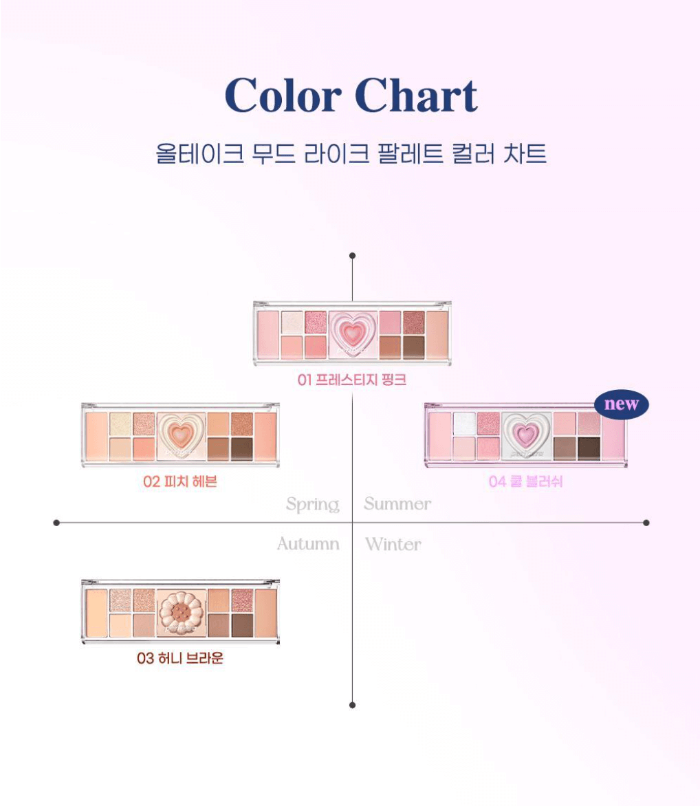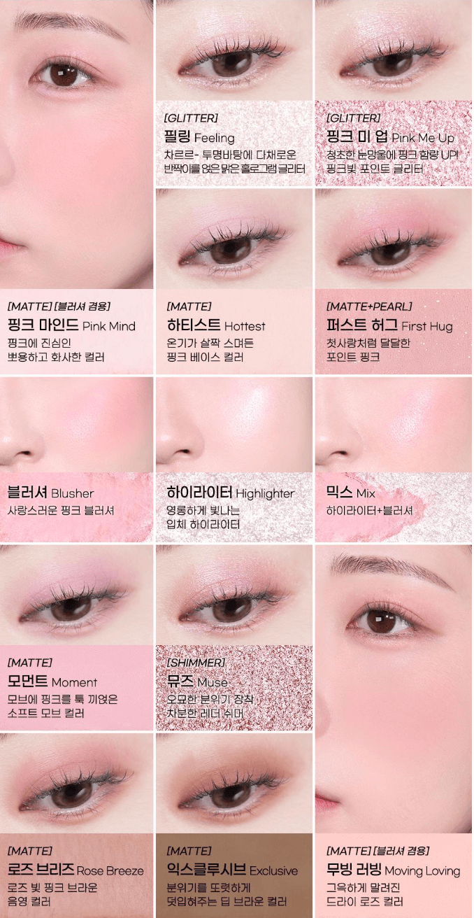 中心心型粉格可作腮紅或打亮使用,質地涵蓋霧面、珠光、亮片,輕鬆打造層次分明的韓系眼妝。